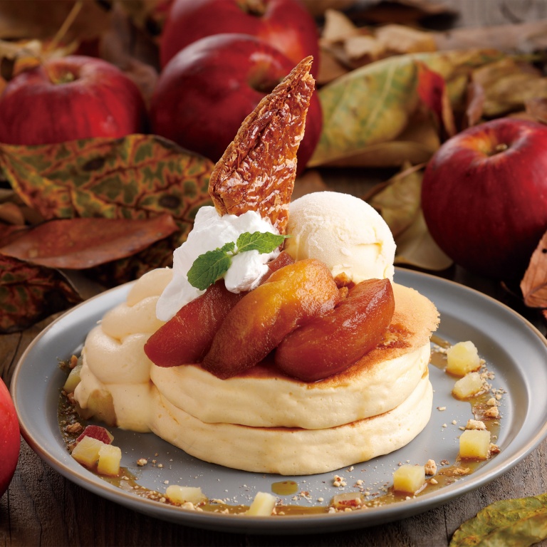 ほろ苦くキャラメリゼした鳥取林檎を、ふわっふわのパンケーキの上にトッピング。 さらに…