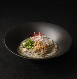 有機豆乳に自家製だしを合わせた風味豊かなかけだしに、旨みと食感にこだわった特製の肉味噌をトッピングし、ラー油をひと…