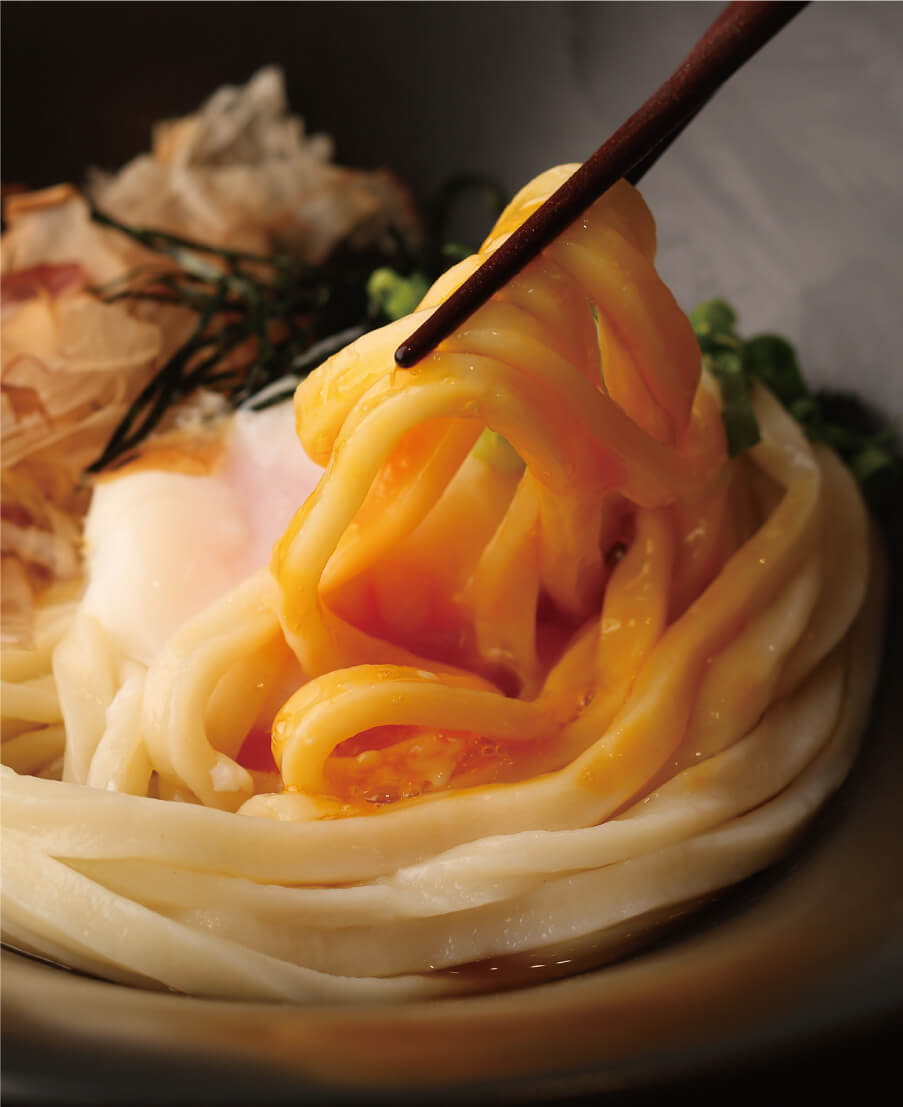 Udon二種類の国産小麦粉をブレンドして作る自家製麺は、天美卵が麺にからむ独自の太さを追求。