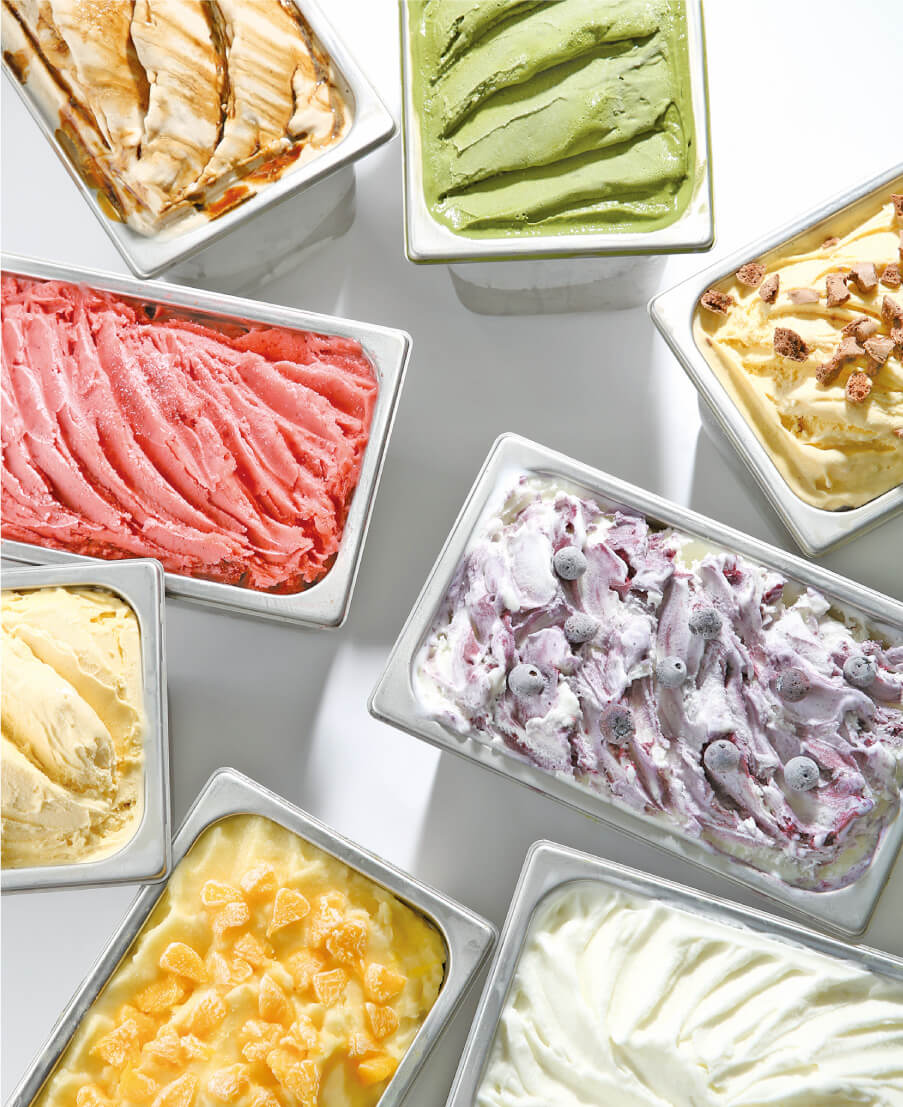 Gelato濃厚な味わいの天美卵バニラをはじめ、季節のフルーツや地元食材などで作られる、色とりどりの自家製ジェラート。