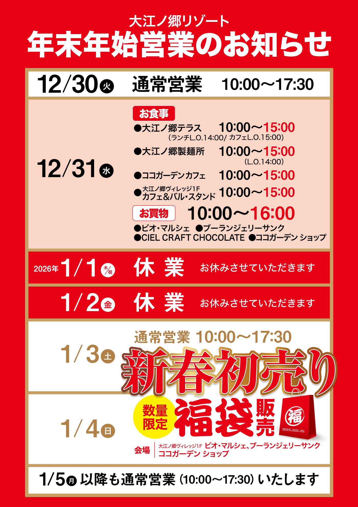 年末は12月31日(水)まで営業。レストラン・ココガーデン・大江ノ郷製麺所などの飲食はそれぞれ下記の通り、各店でのお買い物は16:00までとなっております。