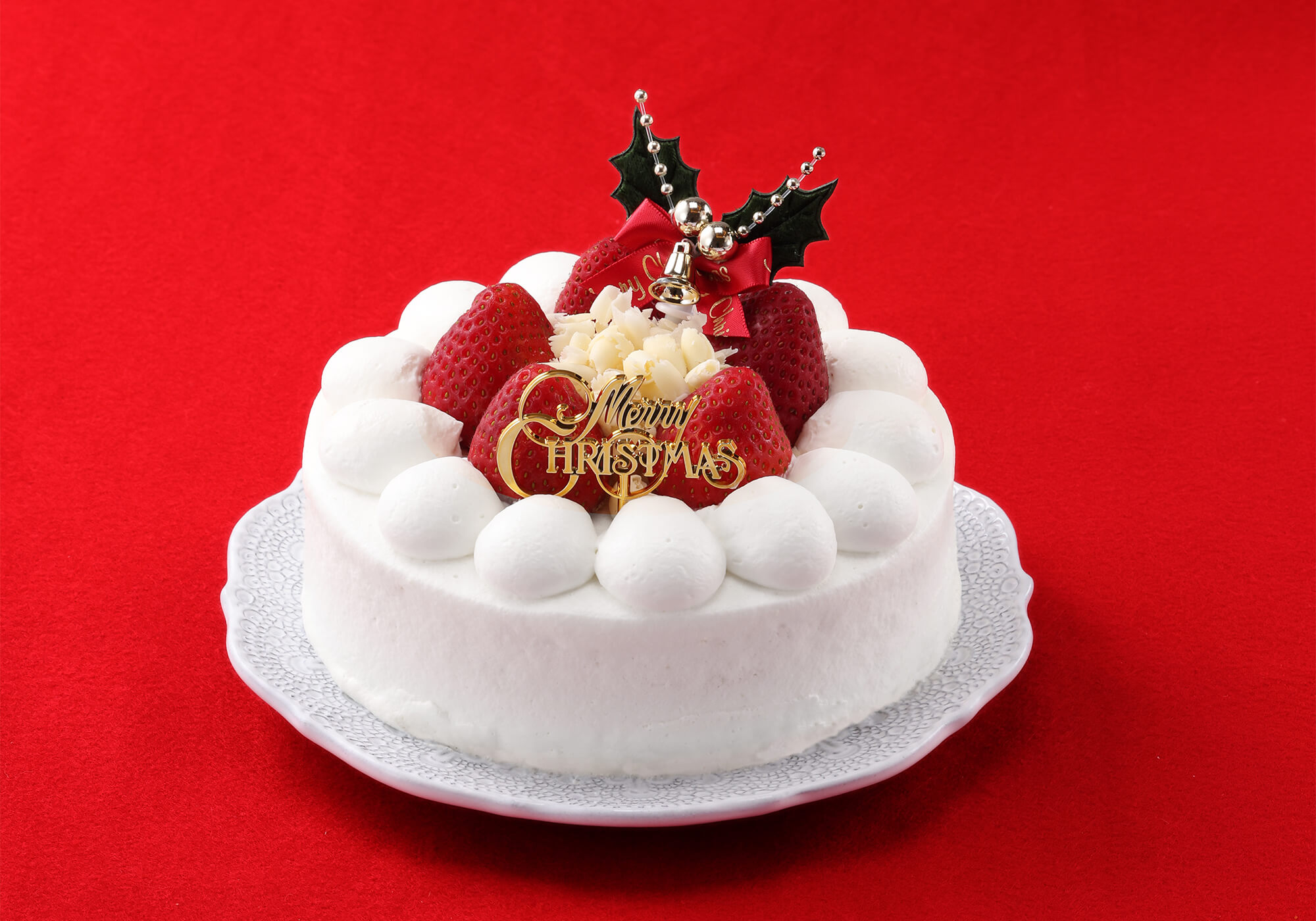 鳥取県産苺の赤、生クリームの白のコントラストが鮮やかなクリスマスケーキ。中はふわふわのスポンジで苺をたっぷり2段にサンドしました。