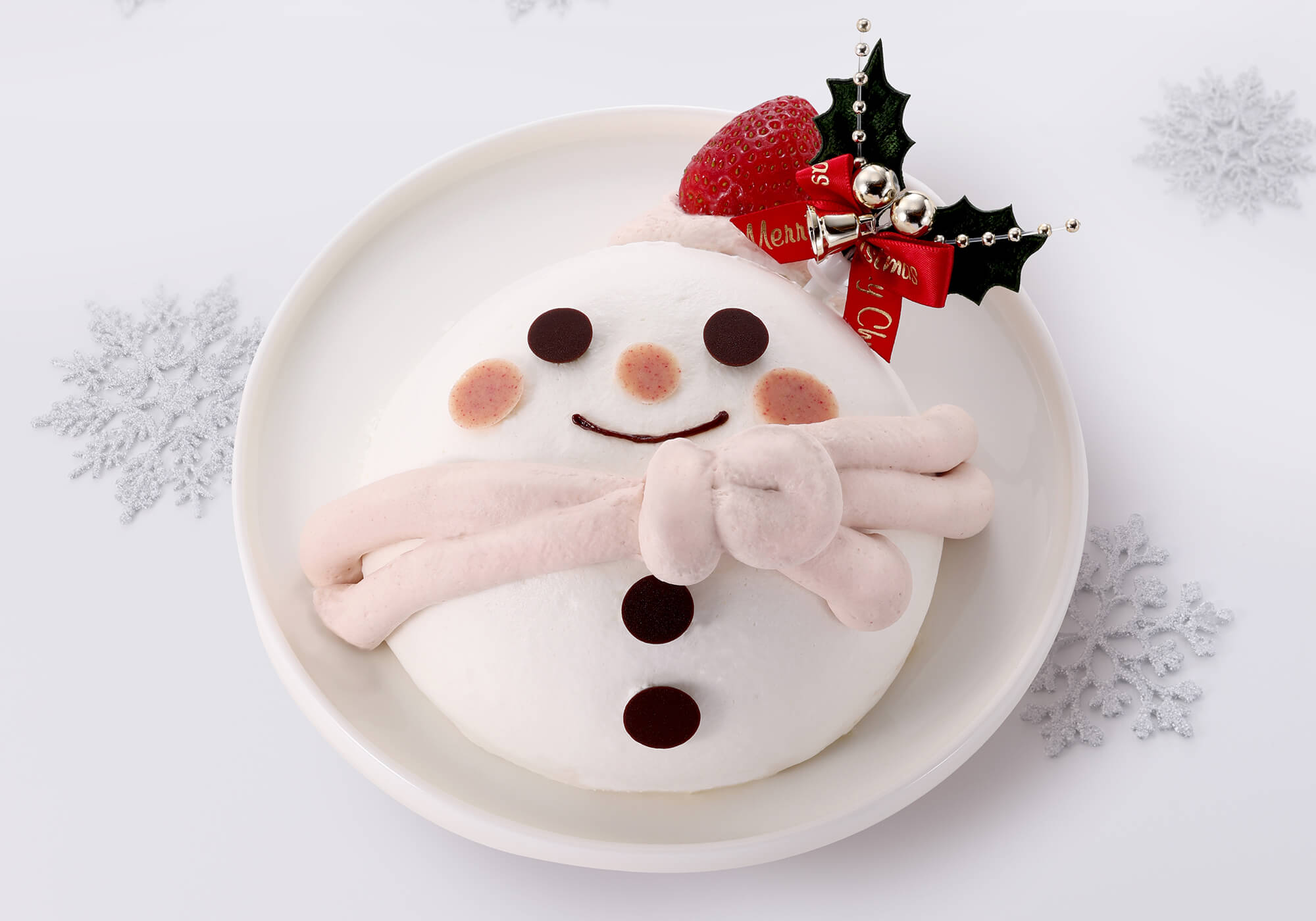 ふわふわの雪で作った雪だるまのようなムースケーキ。レアチーズと苺のムースとスポンジを交互に重ね、滑らかなクレームシャンティーで包み込みました。アクセントに、苺クリームのマフラーと真っ赤な苺の帽子を添えて。