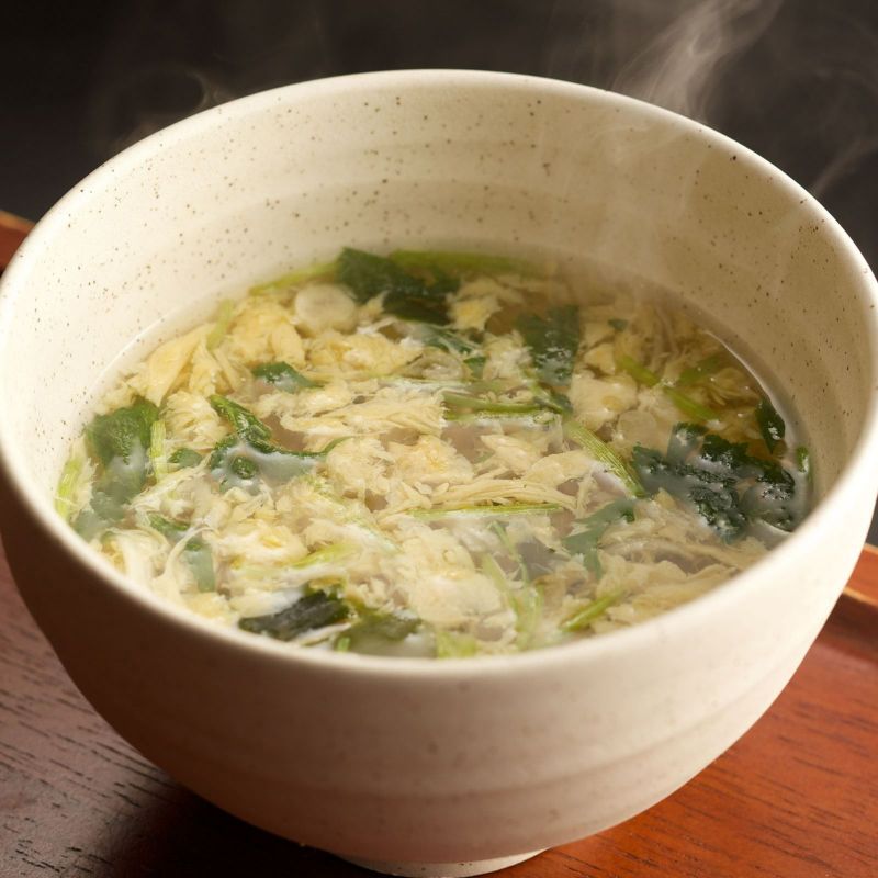 たまごスープ 鰹だし、だし入り醤油、還元水あめ、みりん、食塩、ホタテエキス、でん粉、酵母エキス、昆布粉末、しいたけエキス、具(鶏卵(国産)、三つ葉、白ねぎ、しいたけ、わかめ)、(一部に小麦・卵・大豆を含む)