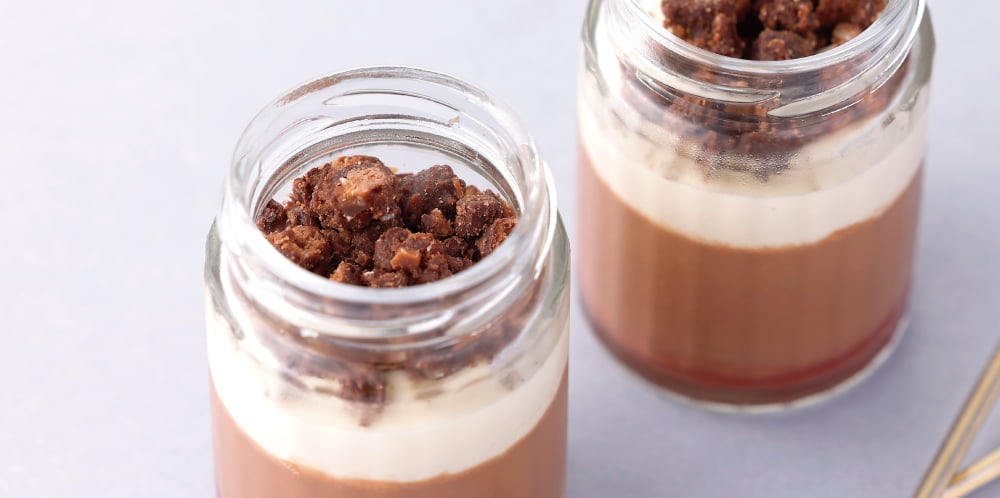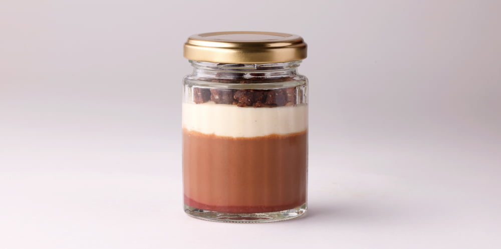 ビター層・クランブルの周りには、カカオ豆から仕立てたビーントゥバーチョコレートを。ホワイト層には、カカオバター・北海道産全粉乳・オーガニックきび糖のみで作るホワイトチョコレートを使用。それぞれの素材特性をいかし、パティシエが瓶詰めのデセールに仕立てました。