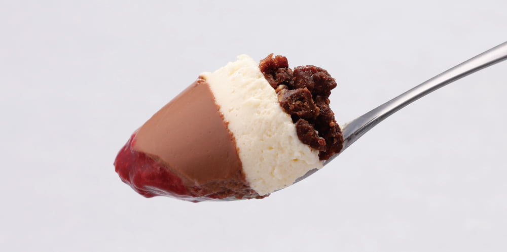 ザクザクとしたクランブルの食感に、ホワイトチョコのやさしいコク、奥行きのあるビターチョコレート。 プリンのようにとろりとなめらかな層を、甘酸っぱいラズベリーソースがきりりと引き締めます。