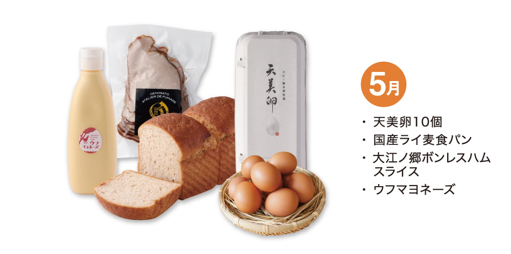 天美卵/生食14日間・加熱調理30日間、国産ライ麦食パン/4日間、大江ノ郷ボンレスハムスライス/10日間、ウフマヨネーズ/90日以上