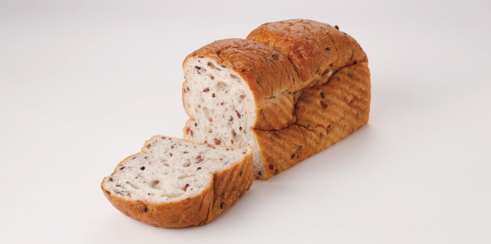 国産の玄米、赤米、発芽玄米、緑米、黒米の5種類の雑穀を使った味わい深い食パンです。