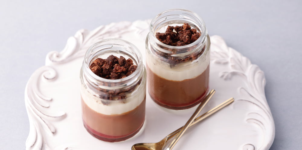 ビターチョコレートとホワイトチョコレートを幾層にも重ね、ザクザク食感のクランブルとラズベリーソースを合わせた、大人のためのショコラデセール。ひと瓶で、奥行きのある味わいの変化をお楽しみいただけます。