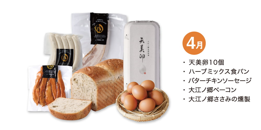 天美卵/生食14日間・加熱調理30日間、ハーブミックス食パン/4日間、バターチキンソーセージ/10日間、大江ノ郷ベーコン/10日間、大江ノ郷ささみの燻製/10日間