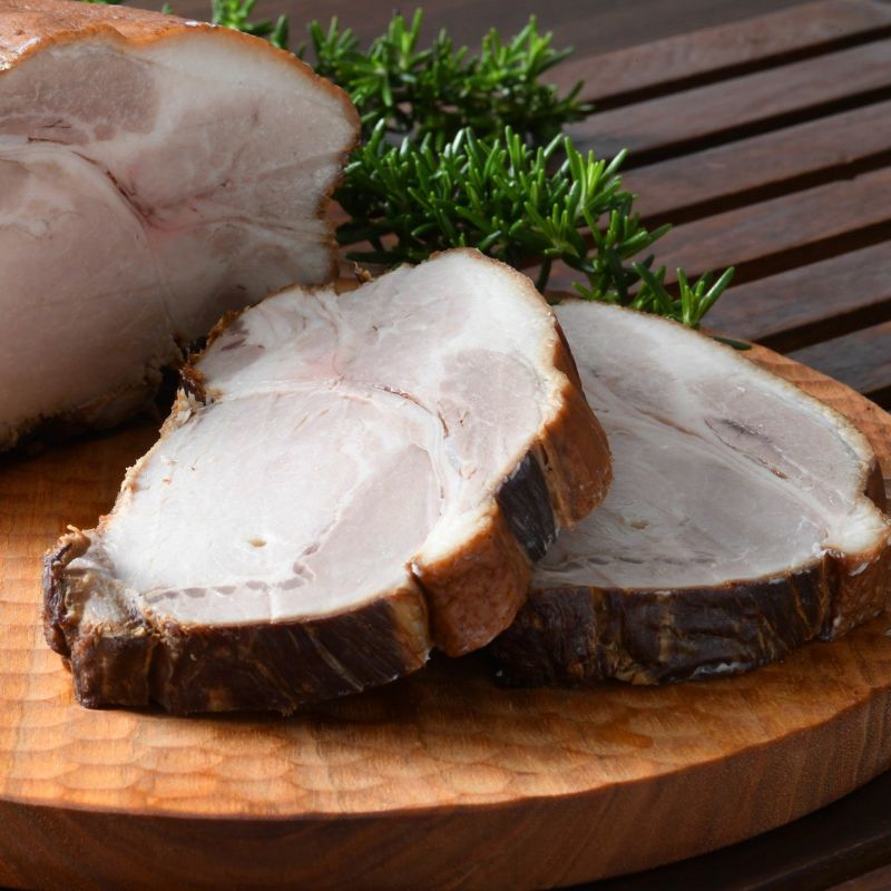 国産豚のロース肉を国産香味野菜を入れた特製塩漬け液にじっくりと浸け込み熟成させたロースハムのブロックサイズ。厚めに切って表面を軽く焼いたら、豪華な一皿の完成です。肉の旨み、脂の甘さ、スモークの香りをお楽しみください。