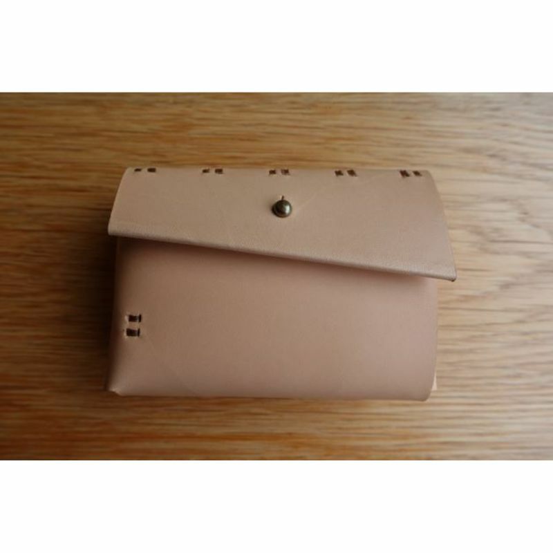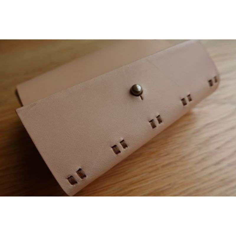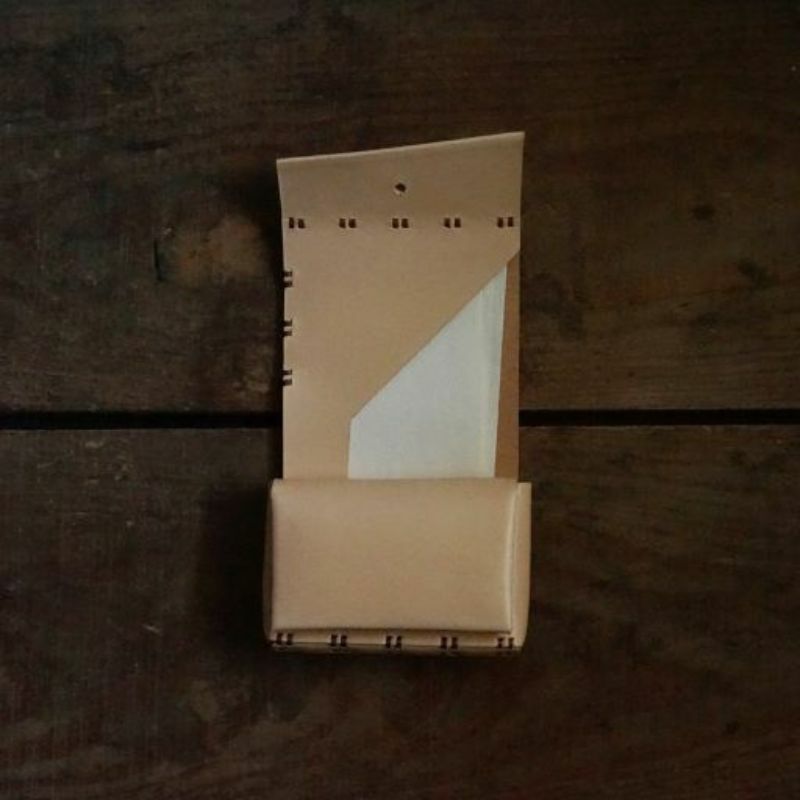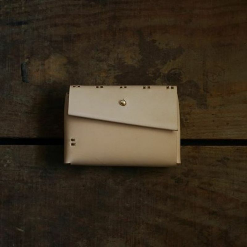 古くからモノを "包む" ことで特別な想いを込め贈り物をしたり、大切なモノを持ち運ぶために "包む" が使われてきました。 代表的なモノとして風呂敷が挙げられます。風呂敷は多種多様な方法で使うことができ、精神的な充実を与える「用」と機能的な「用」の両方を満たしています。 この先人が培ってきた知恵を活かし制作しました。 包 - tsutsumu - シリーズの “小財布" は風呂敷の包み方を参考にデザインしています。札、小銭、カードを手のひらサイズに納められる小財布です。 革を折り畳むように重ね合わせ手縫いで仕上げています。重ね合わせることでポケットができ、手前にカード (10枚程度) 、奥に小銭を入れることができます。見返しにはヘリを残し、部分的に縫うことで小銭を受け止めるよう作っていますので、小銭が見やすく、取り出しやすくしました。蓋部分の留め具は、留め外しやすいギボシを使用しています。
