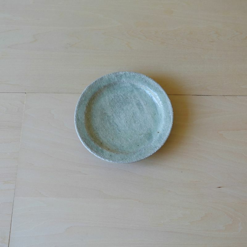 青と緑の間のような色が美しい、料理のとりわけ用にちょうど良いサイズの皿です。ざらっとした質感で、あたたかいきわい窯さんらしさのある品です。