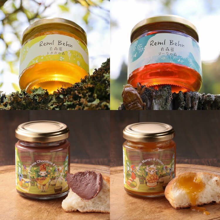 蜂蜜は採れた場所、採れた時期によって味と香りが大きく変わります。「トカカの森」「ジーワの森」という、それぞれに違った個性を持った2種類の蜂蜜。 そして、蓋を開けた瞬間、果物と蜂蜜の幸せな香りがフワッと鼻をくすぐり、ひと口食べると果物の甘酸っぱさと蜂蜜の香りが口いっぱい広がり思わず笑顔になる―。そんなジャムを目指してつくられた、Reml Behnの手作りジャム2種類をセットでお届けいたします。