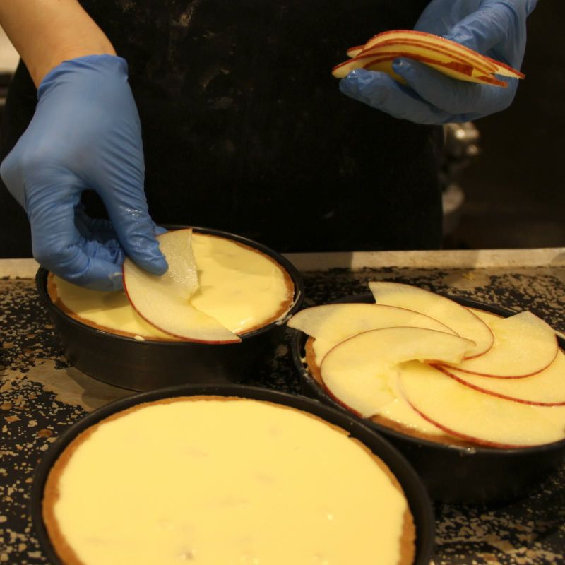 素焼きしたりんごはレモン果汁などとマリネし、タルトの底へぎっしりと敷き詰めます。その上に北海道産クリームチーズ、鳥取県産生クリーム、天美卵の卵黄をベースにした生地を流し込み、仕上げに薄くスライスしたりんごを表面に飾りつけて焼き上げれば完成です。