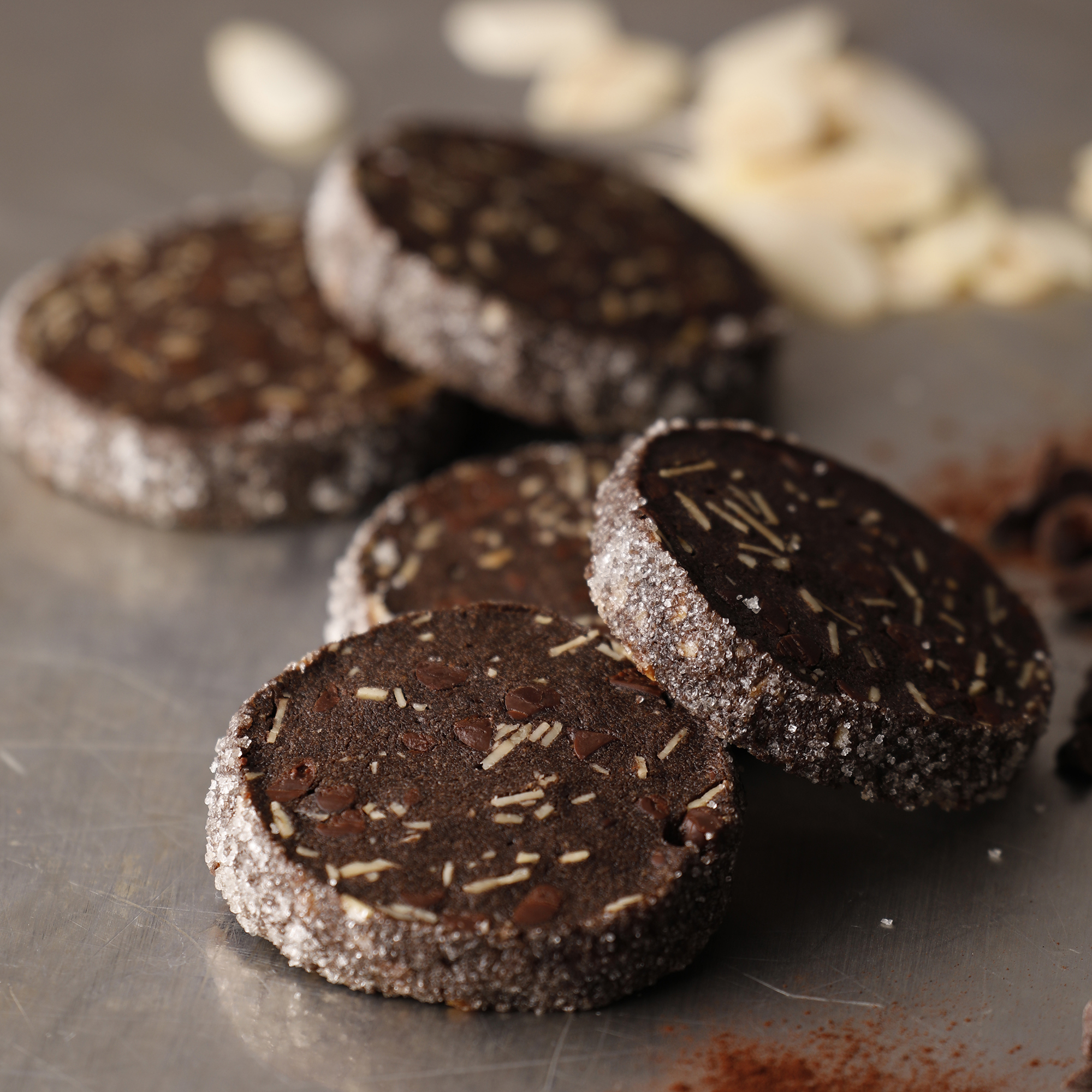 卵白で仕立てたカカオ香るショコラ生地にはアクセントのアーモンドを。「ガナッシュ」「ゆず」「フランボワーズ」「ブルーベリー」「ラムレーズン」の5つの厳選素材をサンドしました。