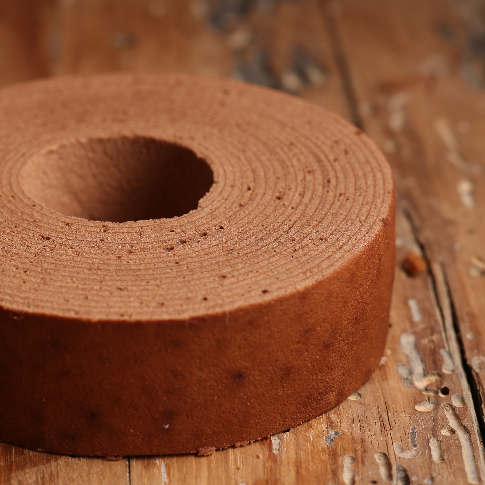 人気のバウムクーヘンをカカオ香るチョコレート生地に。丁寧に1層1層ふんわりと焼き上げました。