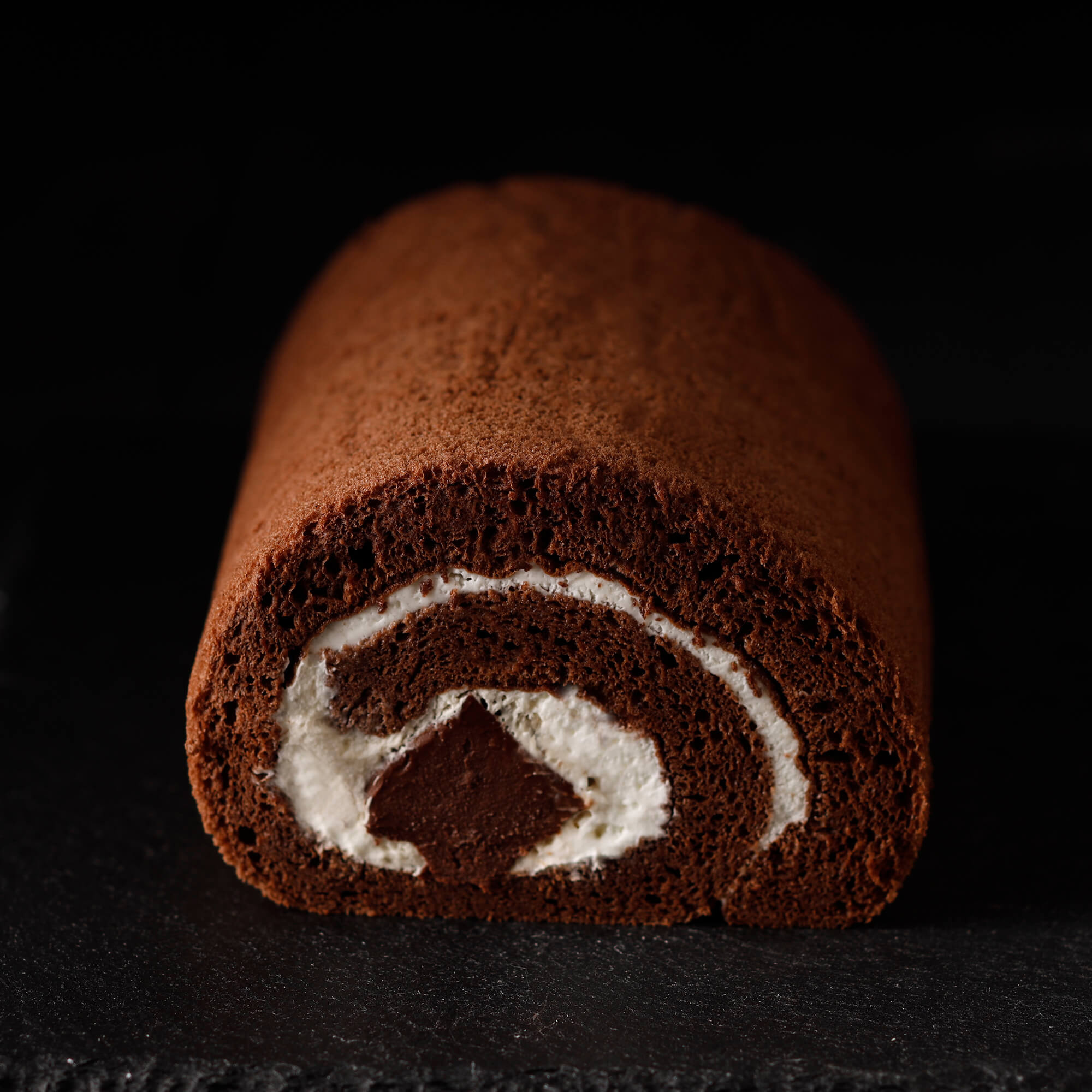 ふわふわしっとりのビターなショコラ生地に、生クリームと丸々1本入った生チョコのとろける食感がたまらないロールケーキ。