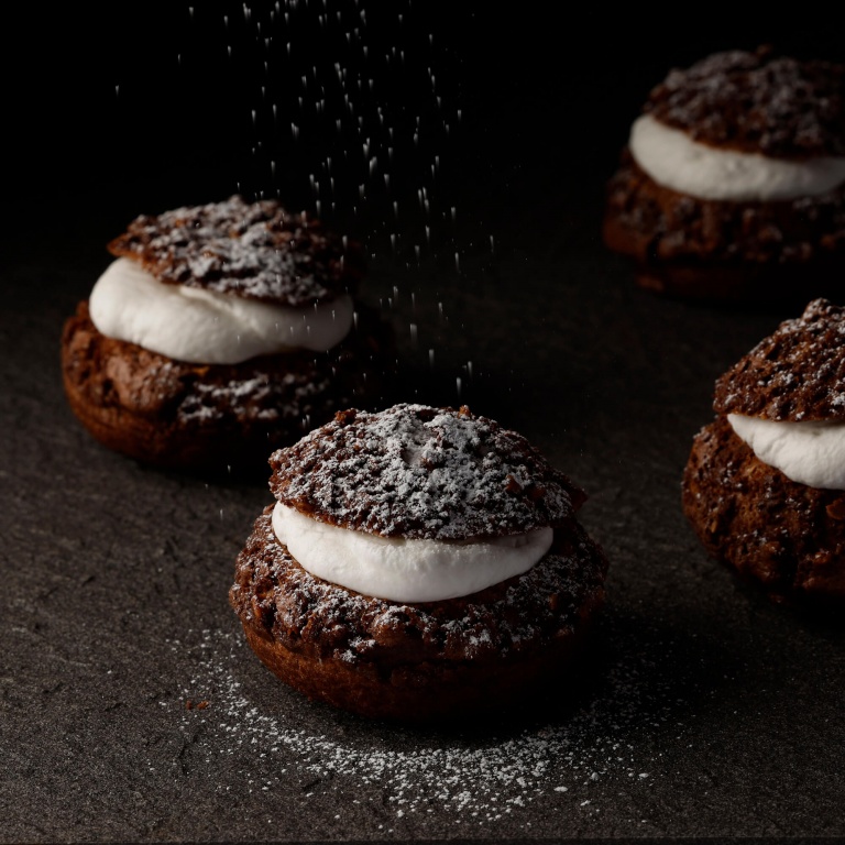 マカロン生地を重ねたザクザク食感のココアのシュー生地にたっぷり詰めたクリームは、天美…