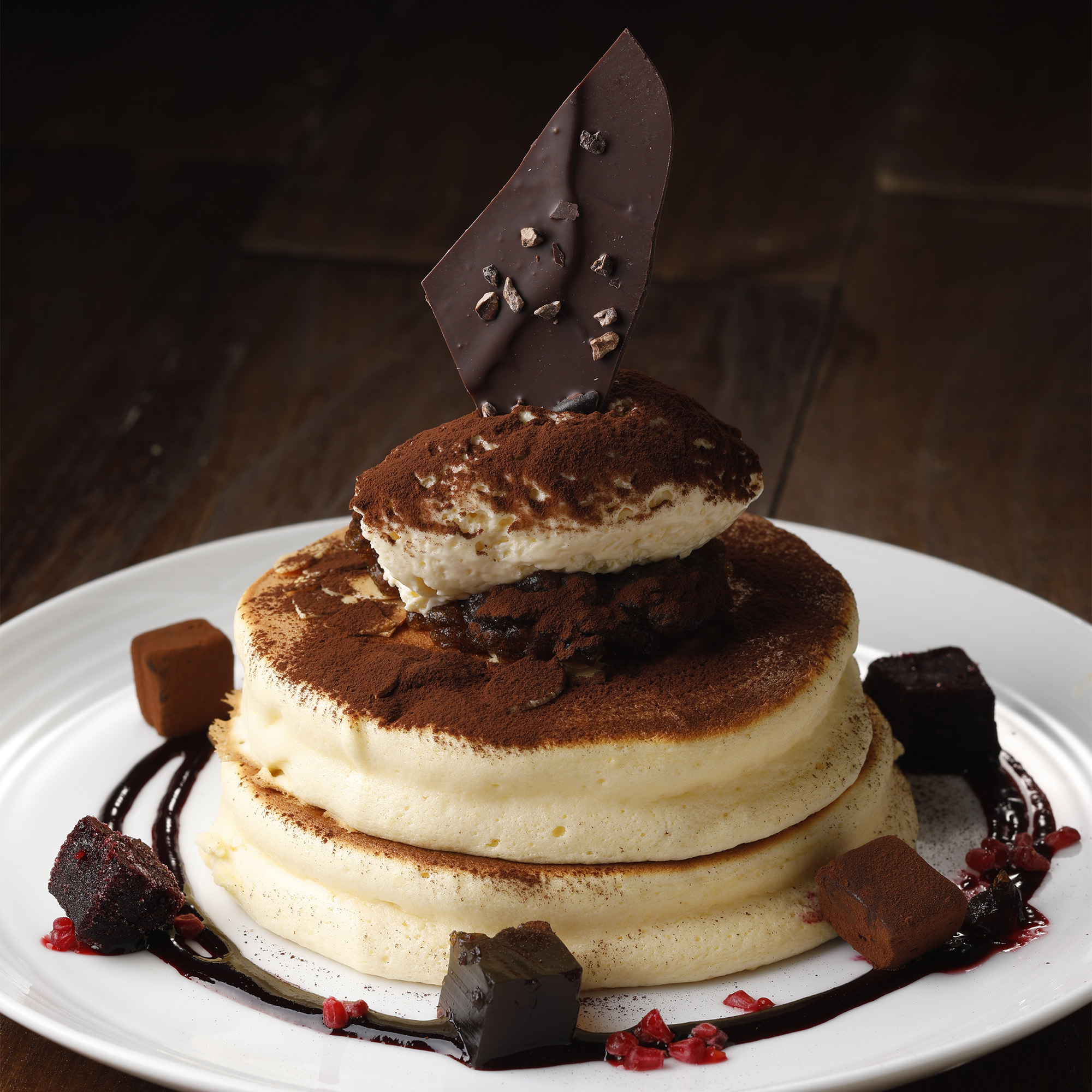 ふんわり焼き上がったパンケーキに、コーヒージュレ、ティラミス風ムースをたっぷり乗せて、ココアパウダーをトッピング。
