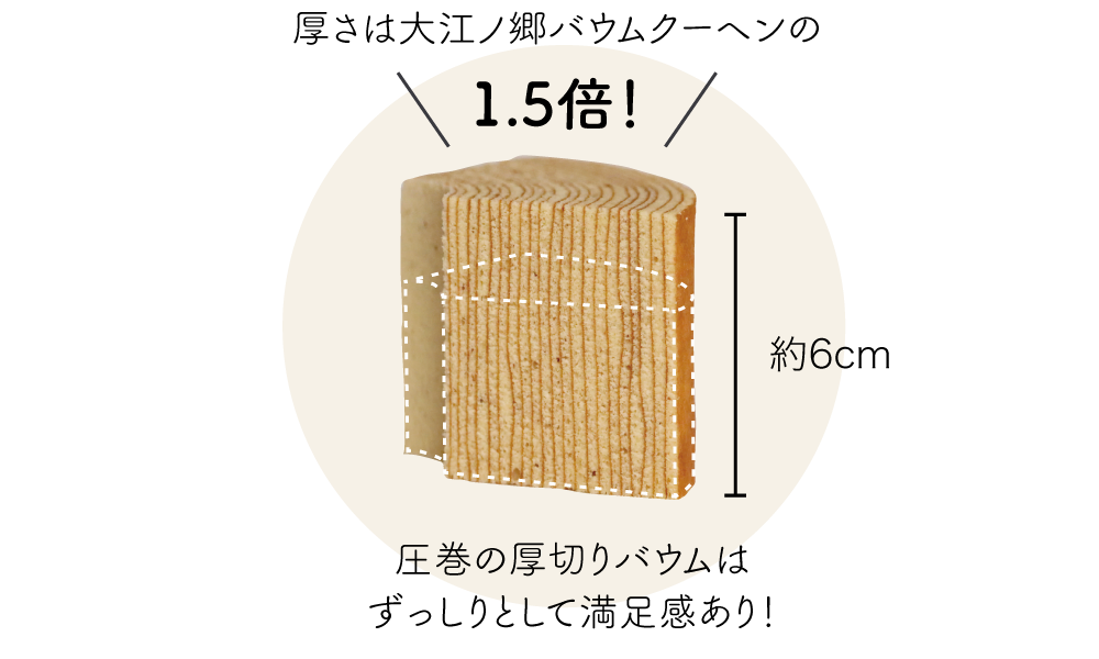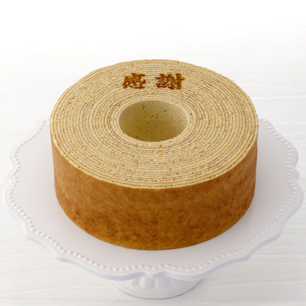 大江ノ郷バウムクーヘンを贅沢に通常の1.5倍の厚切りにし、「感謝」の焼印をほどこした、厚い感謝を伝えるバウムクーヘンです。