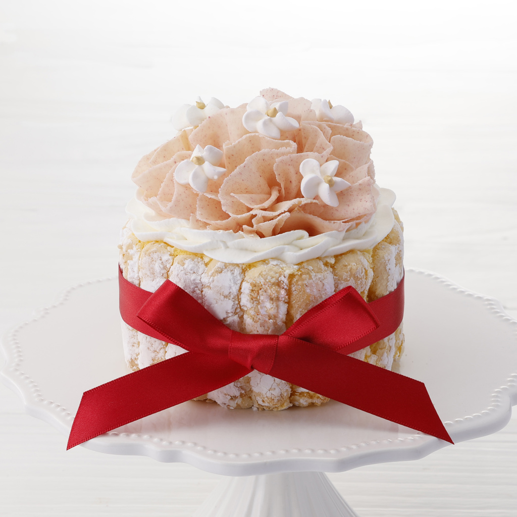 ベリーとヨーグルトのムースにベリー色のホワイトチョコをトッピング。きっと感謝の気持ちが伝わる、カーネーションの花束のようなシャルロットケーキです。