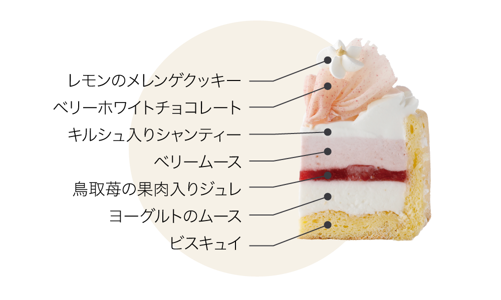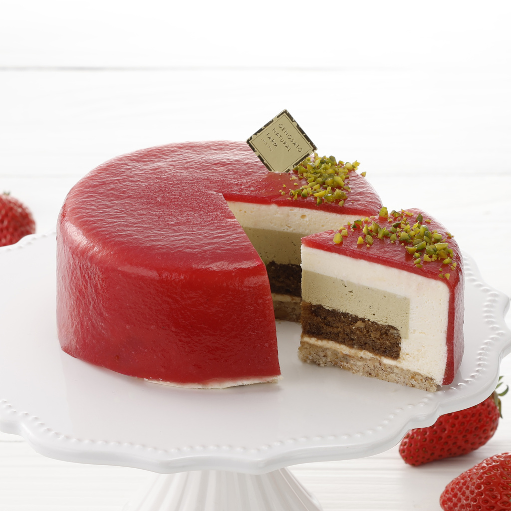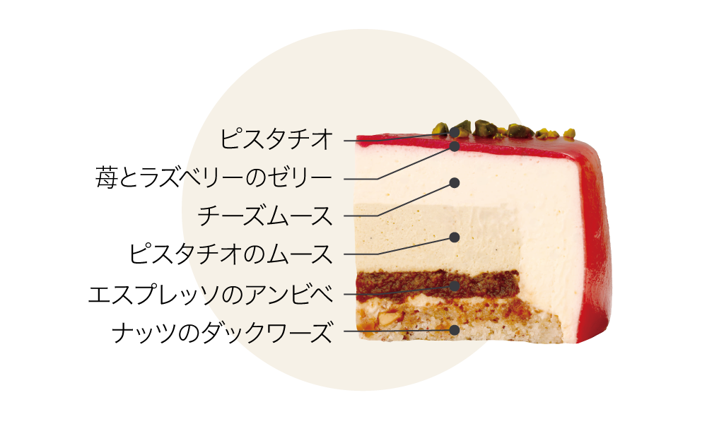 甘酸っぱいベリーのゼリーの下にピスタチオムースやほろ苦エスプレッソスポンジの層を重ねました。