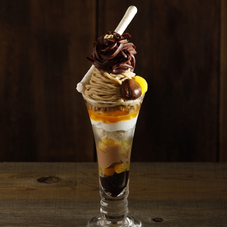 あの、魅力的な秋パフェが大江ノ郷テラスに帰ってきました! グラスの中に様々な栗のスイ…