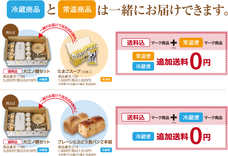 • ※「常温商品」と「冷蔵商品」は一緒に送ることが可能です。