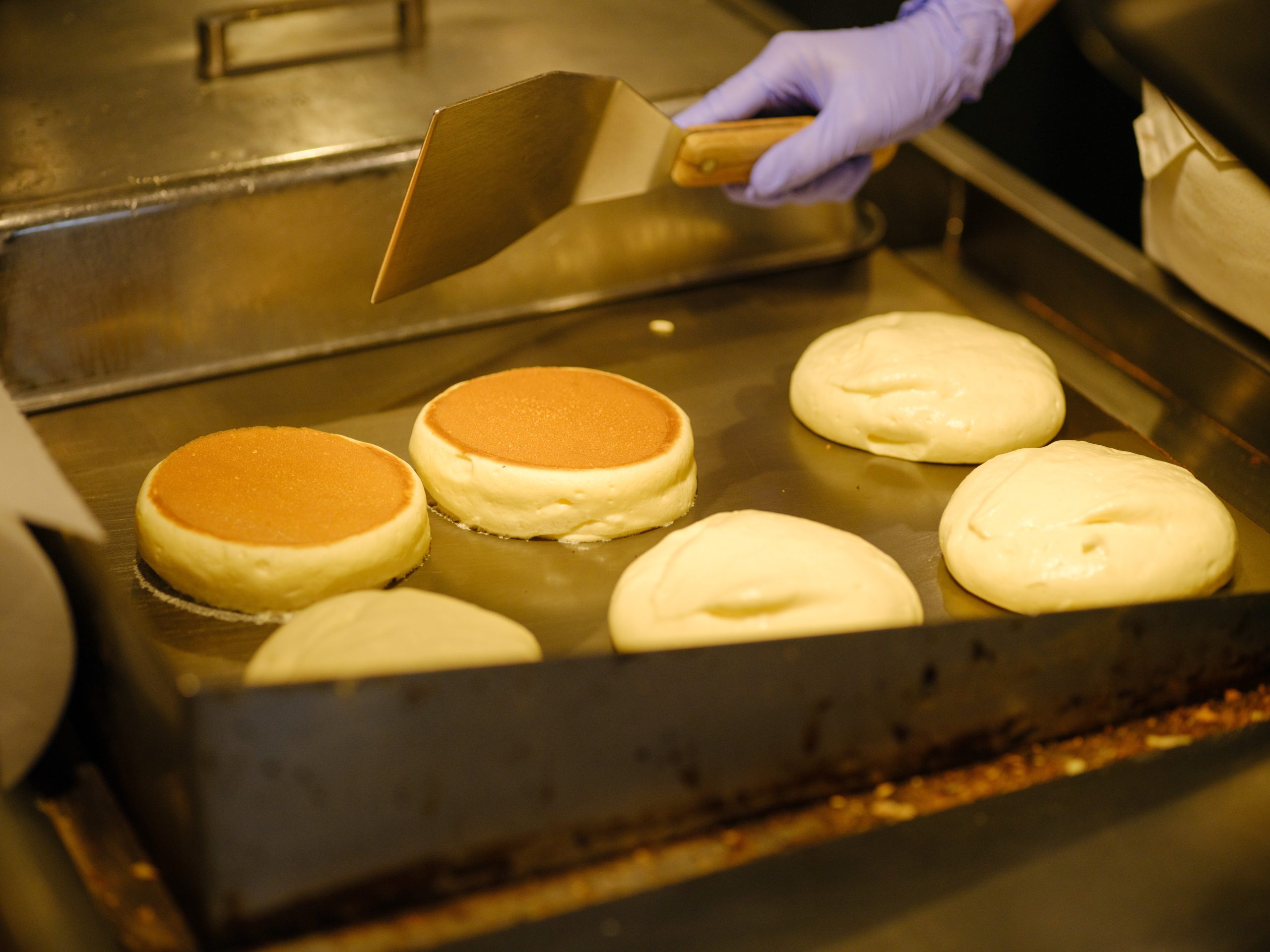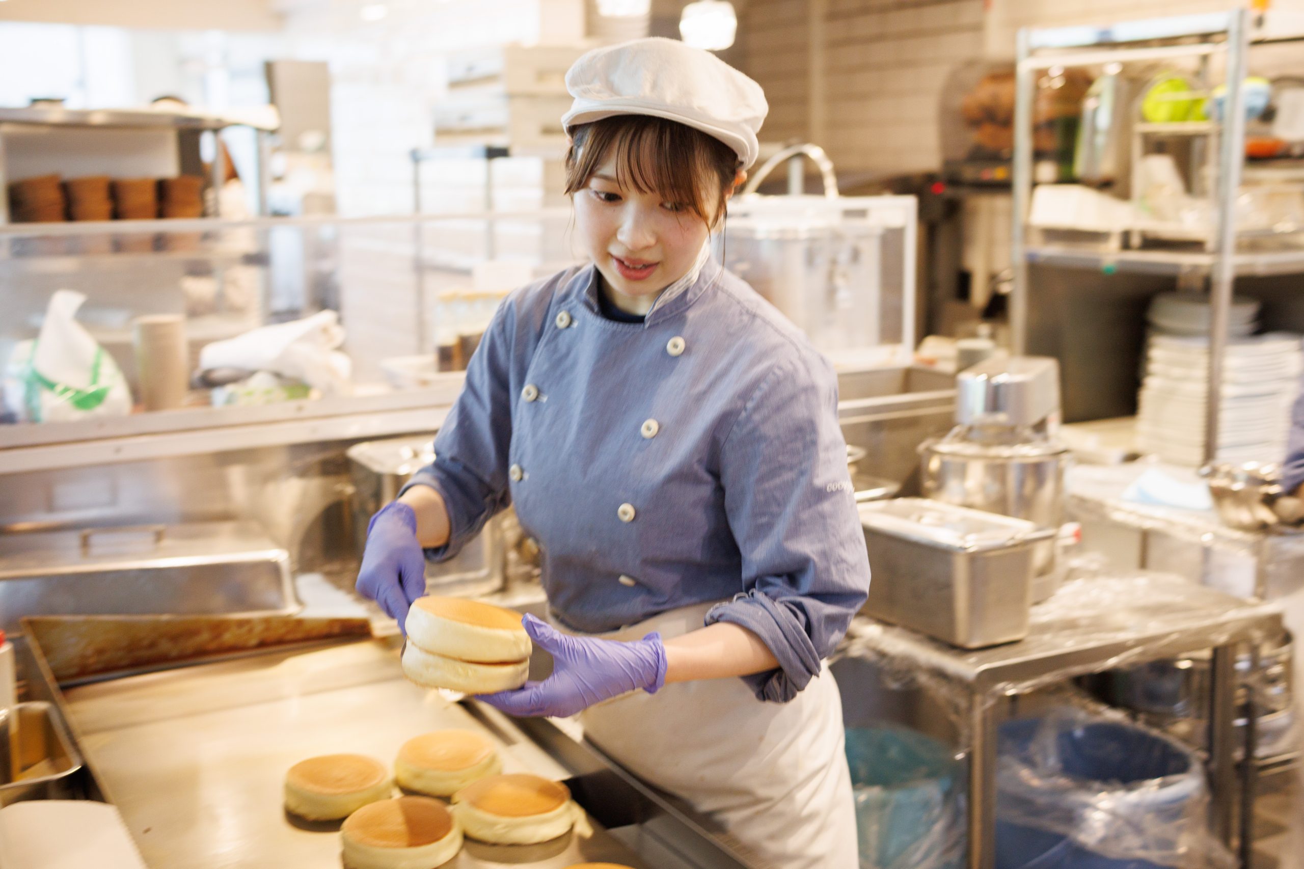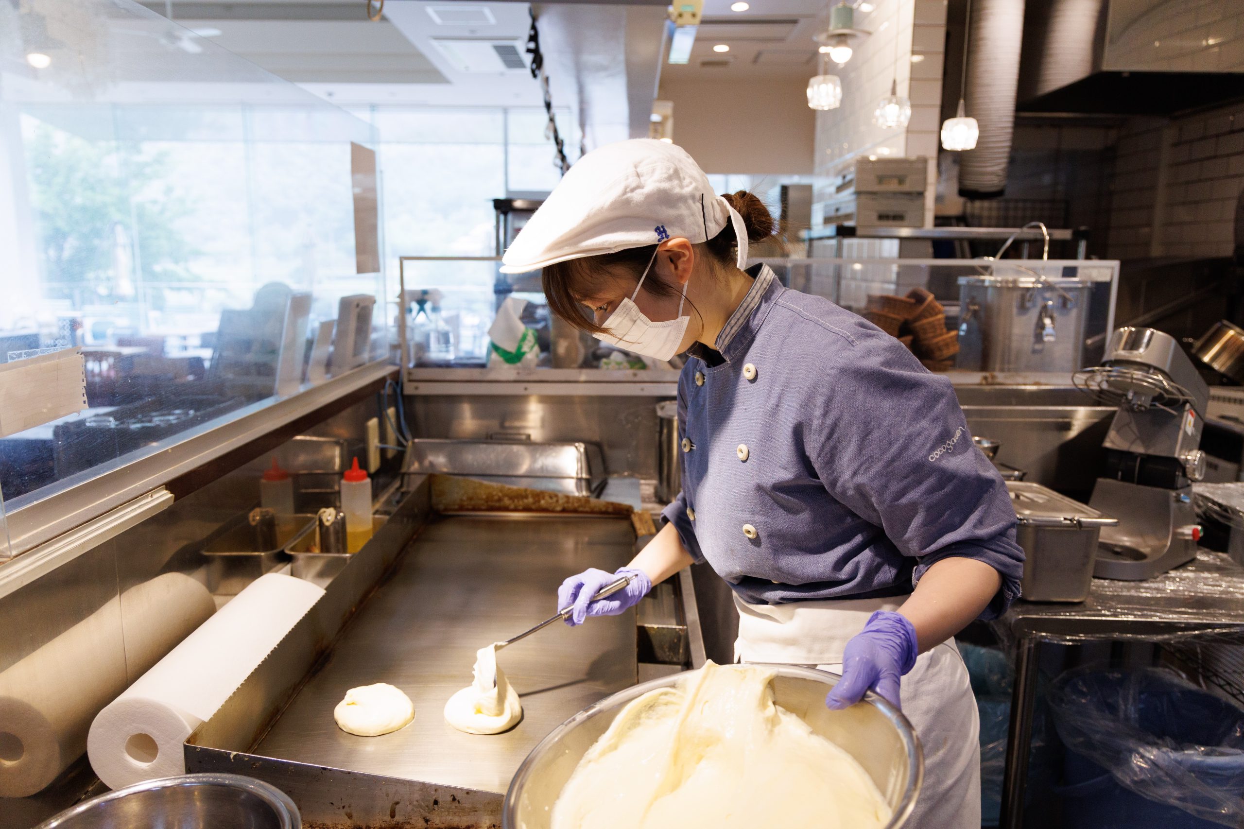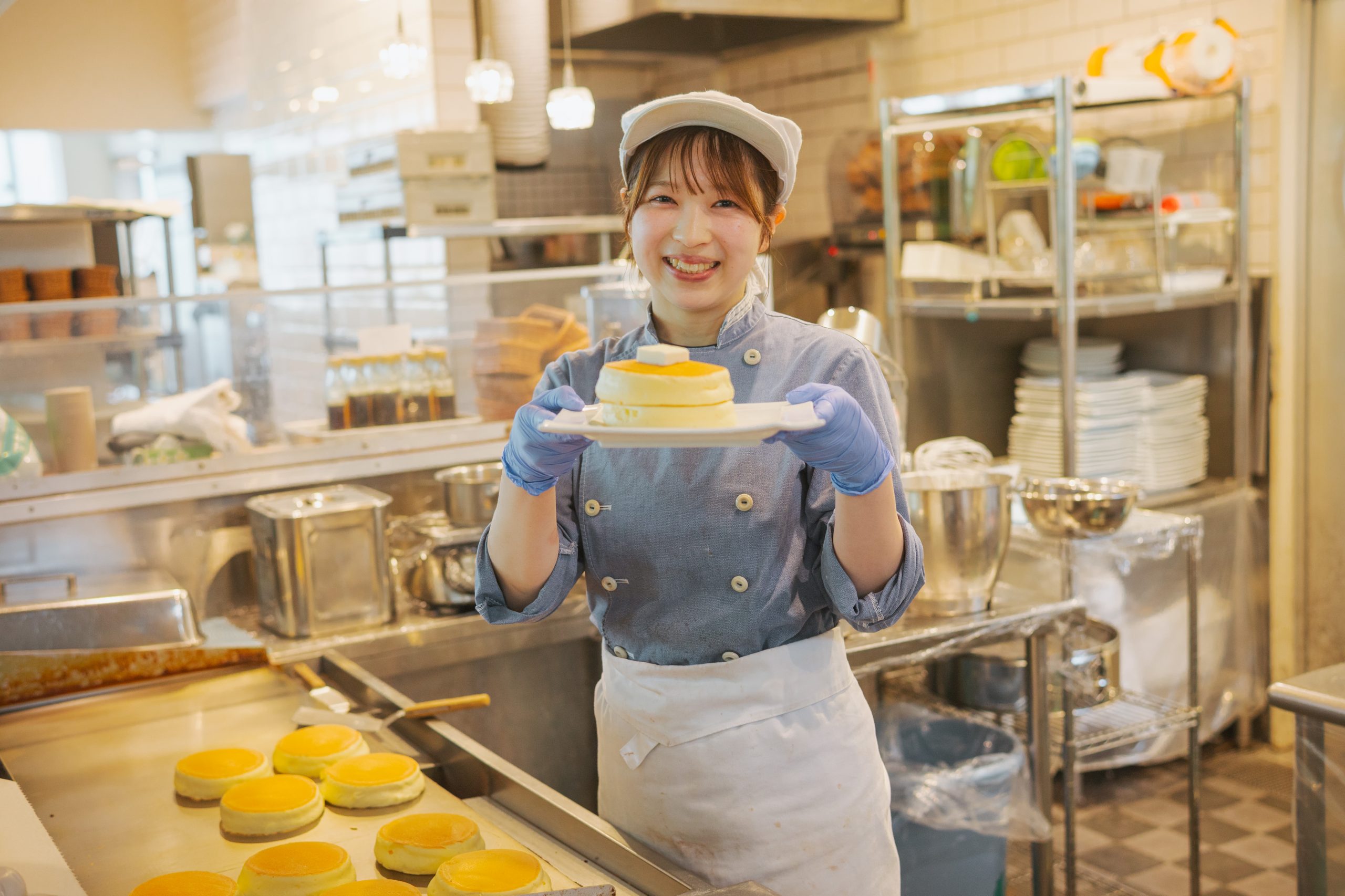 入社直後はカフェのキッチンとサービスのマルチ業務でした。キッチンでは主にパンケーキの盛り付けと卵かけご飯の提供をしていました。サービスでは、お冷だし、パンケーキ提供、バッシングなど、接客業務を行っていました。「作る」と「提供する」の両方を経験できたことで、お客様の生の声やサービス側のニーズが分かり、「作る」ときに意識する視点が広がったので、とても学びになりました。