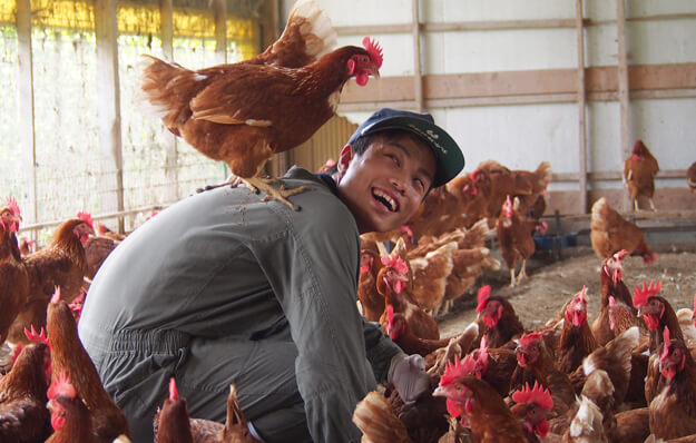 大江ノ郷自然牧場の事業の根幹は卵。それを支えるのが飼育係の仕事です。大江ノ郷自然牧場のコッコは、昔ながらの自然に近い平飼いで、新鮮な水、天然・国産にこだわり自家配合したエサ、大自然の綺麗な空気のもと飼育されています。安心・安全・新鮮な天美卵をお客様へお届けするために、コッコに愛情をそそいで育てています。