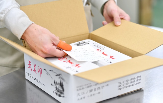 大江ノ郷自然牧場では、新鮮な卵を新鮮なままお客様の元にお届け出来るよう、創業当初より「採卵当日出荷」にこだわっています。お客様の手元にきちんと商品をお届け出来るよう、卵や食品の梱包、配送業務を行っています。お客様が商品を受け取った瞬間に喜んでいただけるよう、ひとつひとつの行程を丁寧に、真心込めて業務を行います。