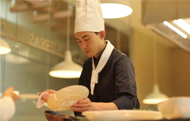 大江ノ郷自然牧場の調理部門は、「食」の楽しさ、鳥取のもつ食材の素晴らしさをお客様に体感していただくことを大切にしており、「パンケーキの調理(ココガーデン)」「レストラン(大江ノ郷テラス・IRORI)」「釜卵うどん専門店(大江ノ郷製麺所)」を運営しています。お客様に「美味しかった」と笑顔になってもらえるよう調理をしながらでもお客様の様子に気を配り、変化に気づく事を大切にしています。