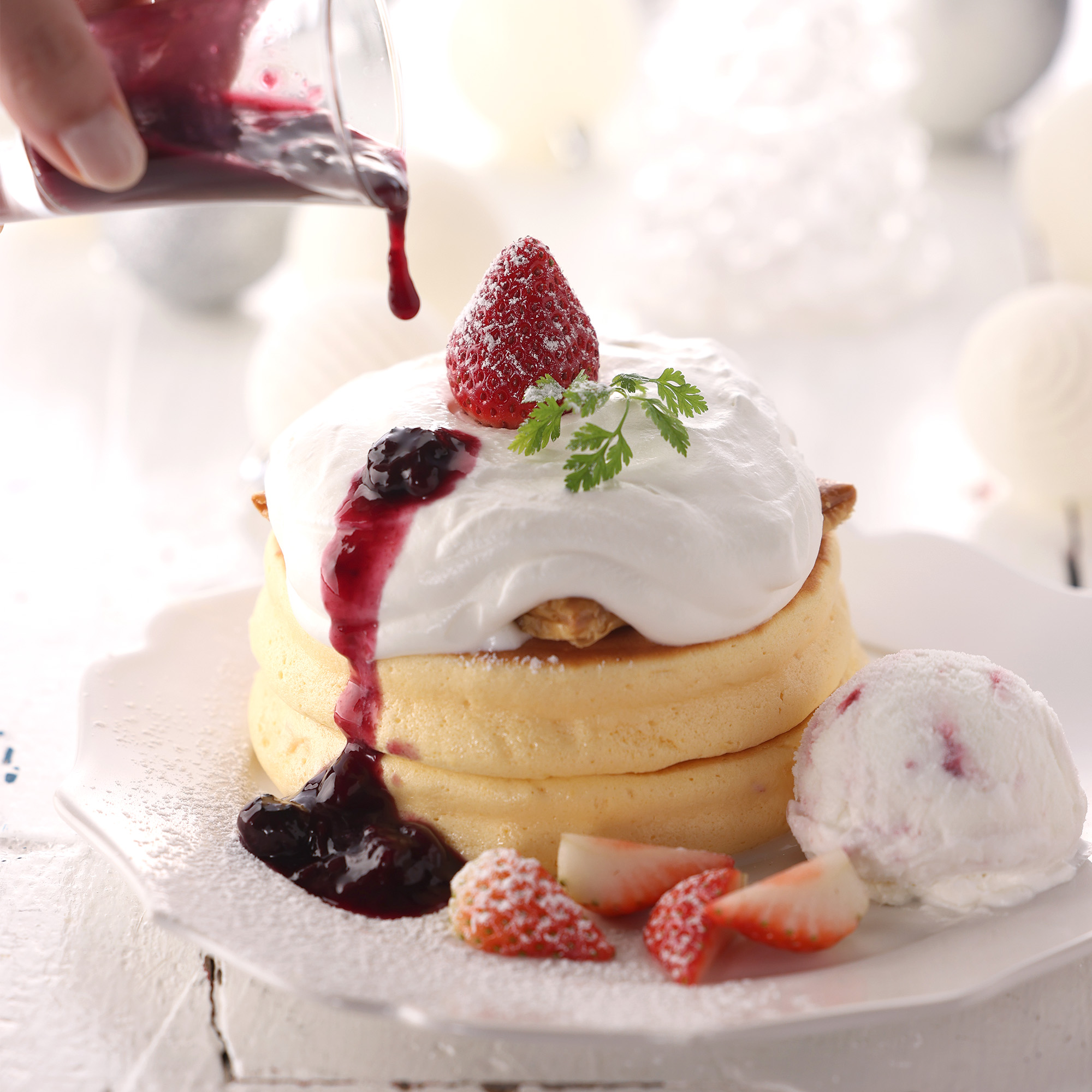ふわっふわに焼き上がったパンケーキに、クリームチーズの濃厚さとキレのよいミルク感たっぷりの真っ白なふわふわクリームをトッピングし、真っ赤なイチゴを飾ったクリスマスにぴったりの一皿。