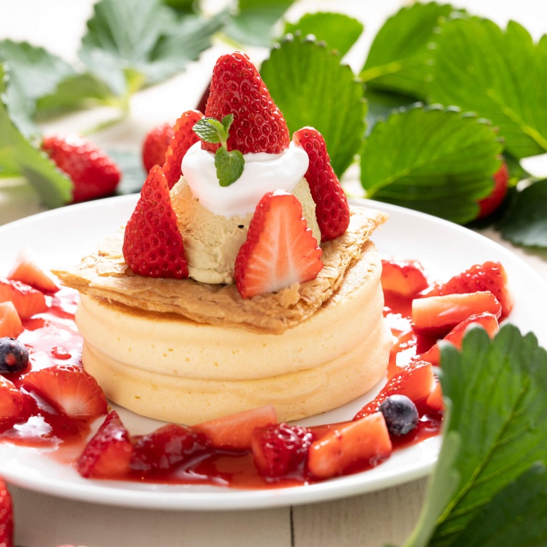 鳥取県産のフレッシュな完熟苺たっぷり、春限定パンケーキ!パンケーキに重ねるのはサクサ…
