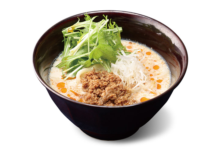 有機豆乳に自家製だしを合わせた風味豊かなかけだしに、旨みと食感にこだわった特製の肉味噌をトッピングし、ラー油をひとかけ。