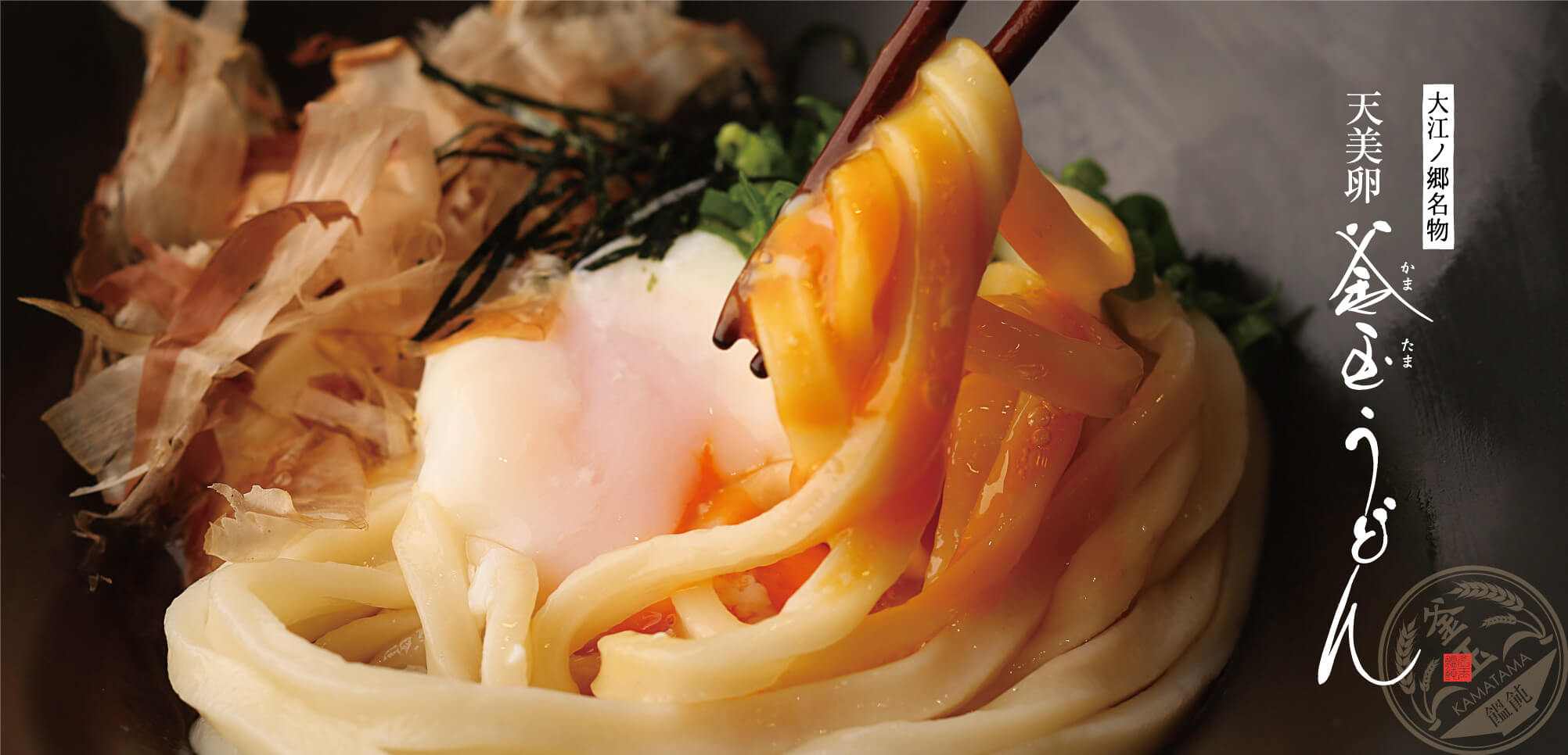大江ノ郷製麺所では、名物・釜玉うどんの他、