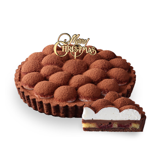 ココアのシュクレ生地に、グリオットチェリーのコンポートをしのばせたアーモンド香るダマンド、天美卵を使用したアングレーズとチョコを合わせた濃厚なクリームを重ね、キルシュ入りの香り高いシャンティーとココアパウダーでデコレーションしました。